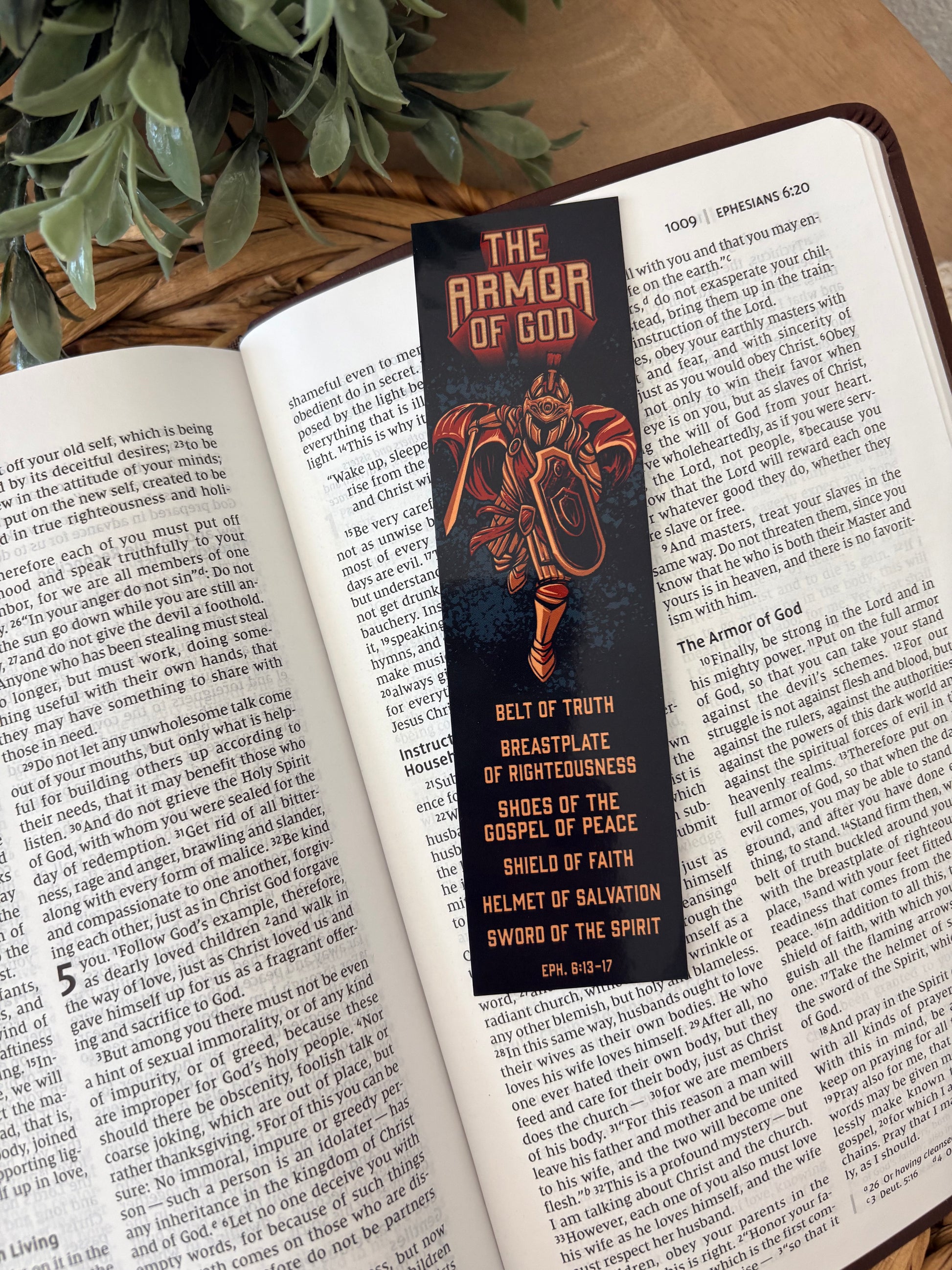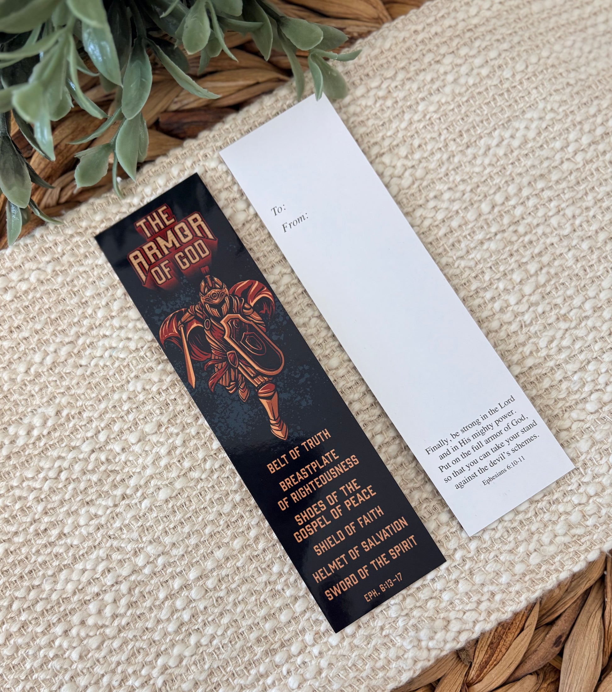 The Armor of God: Belt of Truth, Breastplate of Righteousness, Shoes of the Gospel of Peace, Shield of Faith, Helmet of Salvation, Sword of the Spirit, Ephesians 6:13-17, Space for note on back, Additional Scripture on back, Finally, be strong in the Lord and in His mighty power. Put on the full armor of God, so that you can take your stand against the devil's schemes., Ephesians 6:10-11,